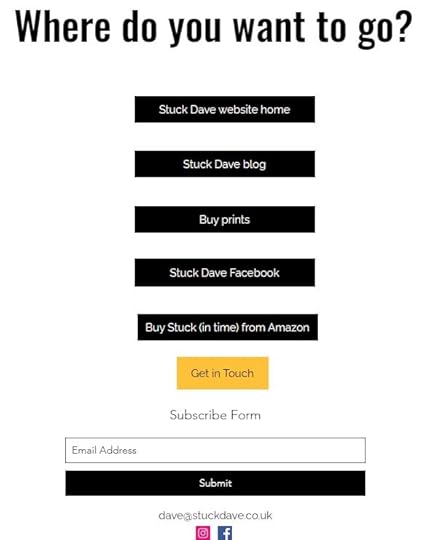 Or, if like me, you create your own web pages, you make a page which has a number of buttons (rectangles that link to other web pages) see above. You make it so this page is not visible on your websites navigation bar (on wix there is a symbol of a crossed out 'eye' to hide this page.) So on mine, I have included my website & Facebook page, but more importantly a link to the Amazon page where you can buy the book.