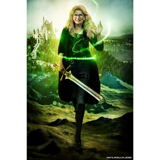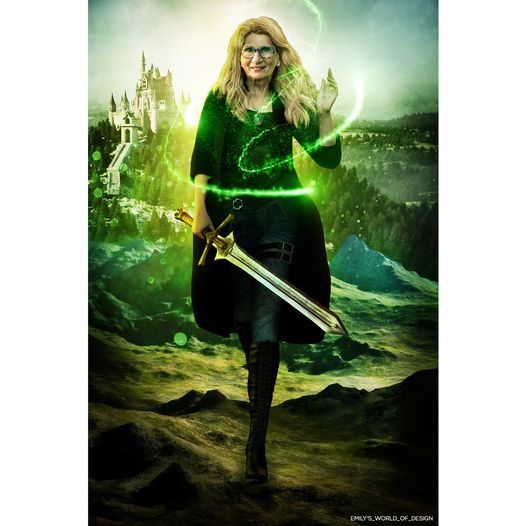Meet Carol Butler, a fan of C.K. Donnelly’s debut novel YA fantasy novel, “Trine Rising, The Kinderra Saga: Book 1” and our newest “Fal’kin Defender.” As a winner of one of the raffle prizes from a recent author event with Donnelly, Carol was able to choose the details of her customized digital rendering as a character from Donnelly’s “Trine Rising” novel. Carol selected to be a Fal’kin Defender, possessing the Defending Aspect—conferring agility, fighting prowess, and extraordinary situational awareness—and a green peridot gem in her amulet with silver metal work. This exquisite picture was rendered by the talented digital artist and cover designer Emily Rakić, of emilys_world_of_design . Carol’s reaction is priceless, and is all a storyteller could ever want from her readers.