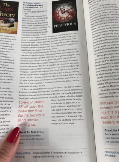 “The Cooks conclude their near-future Percivious trilogy with an epic collaboration between species […] Readers will savor the uplifting conclusion to an ambitious saga. Lovers of intricate SF will enjoy this finale that finds Earth’s two intelligent species teaming up.