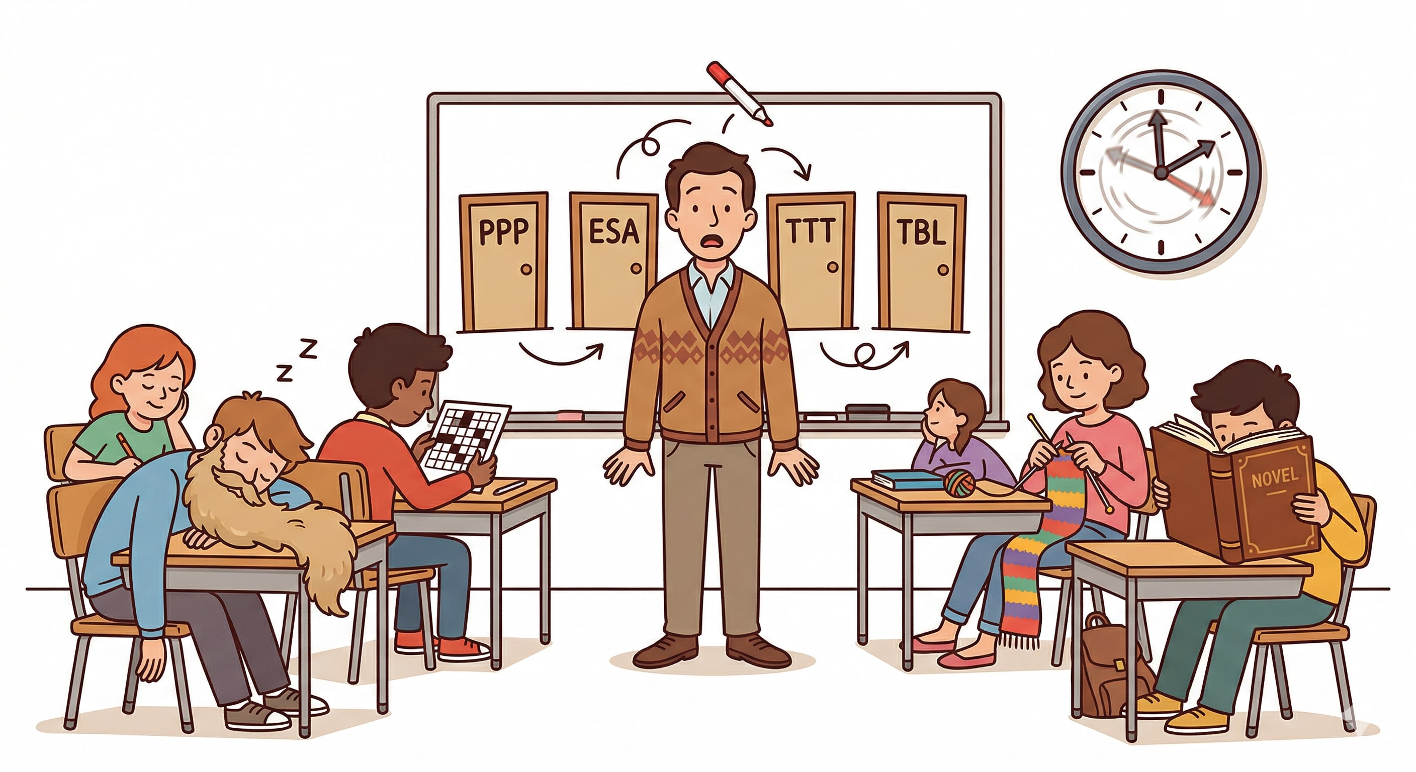 I remember sitting in a teacher training input session, notebook open, genuinely convinced that choosing the wrong framework would ruin a lesson. PPP felt safe but limiting. TBL felt exciting but risky. ESA felt like a compromise. TTT felt like cheating somehow - like I was admitting I hadn’t planned properly.
