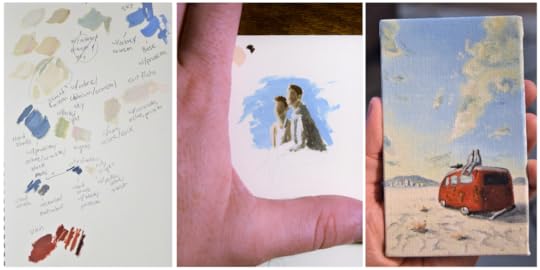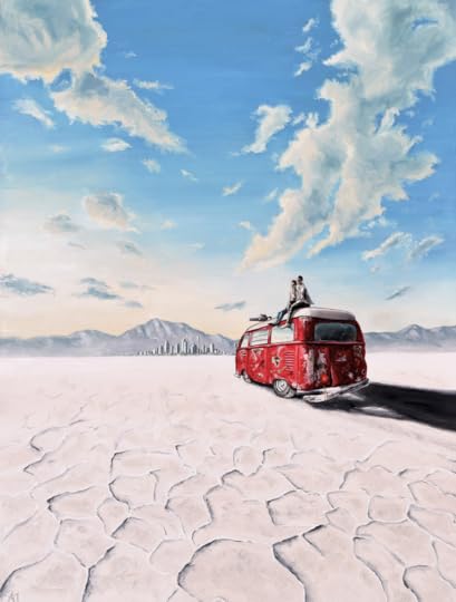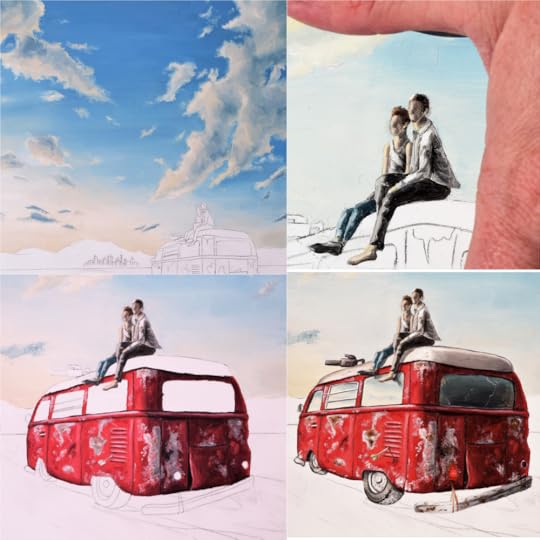 I gathered a lot of references and inspiration images, and thought hard about the composition. I decided it might be better to have Valentine and Osric sitting together - for one because it would be hard to see Osric through the van's windshield, and two because I wanted a bit of the cozy romantic feel that's in the book. I wanted an interesting angle for the van, and aligned all of the elements so that they were pointing toward the city in the distance.