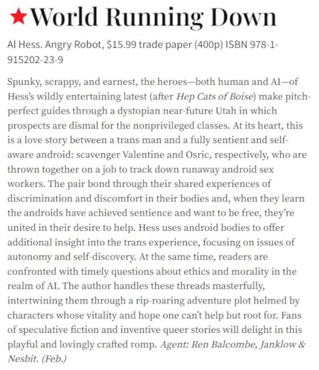 HOWEVER, my indifference to reviews does not extend to getting a starred Publishers Weekly review! I can barely believe it. Publishers Weekly reviews around 10,000 books a year, and only gives a star to about 500 of them. Only 5%, and they gave one to World Running Down along with an absolutely glowing review. My friends keep telling me they aren't surprised, but I struggle to wrap my head around it. Everything about my trad publishing journey has had difficulty sinking in.