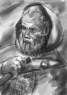 En estos dibujos lo vemos, a color, con sus canas indicando sus años, en el momento en que se une a las huestes del Fénix. También se le puede ver joven, con la dignidad de un duque y gobernador imperial; y bajo la apariencia de barquero, en sus años de proscrito. En el fondo, Sarpes, la ciudad a la que dedicó la mayor parte de sus esfuerzos. He querido que en el primer dibujo aparezca en sus tres facetas, recapitulando así, de algún modo, su vida.