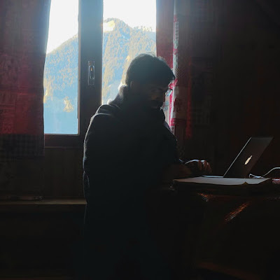 La semana pasada tuve la dicha de pasar unos días en las montañas. Me fui a perder allá, mientras otros esquían, esencialmente para avanzar en la redacción de mi tesis. Así es: la foto con la que comienzan estas líneas soy yo escribiendo, pero no ficción, lo siento. Sin embargo, aunque mi tiempo lo dediqué en parte a los cantares de gesta que son el objeto de mi estudio, el ambiente evocaba para mí fuertemente los albores de mi propia gesta, Crónicas de una espada.Hace más de 20 años que no estaba por allí. No lo he dicho todavía, pero el lugar de mi retiro erudito fueron los Alpes. Una enorme suerte que no pensaba tener. Estuve del costado francés, en un pequeño villorrio de nombre Chalmieu. Pero hace veinte años estuve en estas mismas montañas, imberbe aún, por el lado italiano de Val d'Aosta. Con mi familia —vivíamos entonces en Italia— subimos el valle hacia el Mont Blanc y de ahí pasamos a Chamonix. ¿Por qué les cuento todo esto? Porque fue entre esas estribaciones que nación Gáradras, la Corona de las Montañas, la Ciudad de Oro.