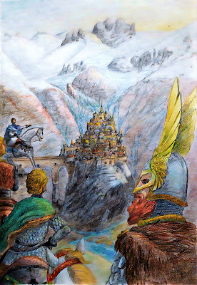 La ciudad de Gáradras estuvo presente desde los primeros borradores. La primera idea fue la de un asentamiento sobre los árboles, una red intrincada de puentes y pasarelas que hubiera dado nacimiento a una villa suspendida a media altura en el bosque. Pero rápidamente deseché esa idea, quizás demasiado influida por las novelas de Dragonlance que acababa de terminar. Y el lugar de la Gáradras arbórea fue tomado por la Gáradras de piedra, por la Gáradras que nace desde el peñón desnudo de una montaña, en el corazón de la Cordillera del Norte. No era solo un castillo, sino toda una ciudad que florecía sobre aquellas alturas, con sus agujas y cúpulas de oro brillando al sol y el justo título de Corona de las Montañas. Para los que conocen Crónicas de una espada, les resultará familiar el dibujo de la portada del segundo Canto, donde la protagonista es justamente esa ciudad: