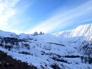 Y así llegamos también a la semana pasada: porque tomándome un descanso de mi encierro, decidí salir a caminar una vez que la nieve dejó de caer. El día era maravilloso, y nada más empezar una breve ascensión, que me llevaría a un promontorio desde el que mirar el valle, vi delante de mí las Aiguilles d'Arves (Las Agujas de Arves):