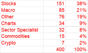 I chose those categories with the help of an AI tool and they seem to make sense, although I have done limited checking of the AI’s categorisation. Just under 40% are on stocks, probably the easiest thing to write about; although picking good stocks and writing well is another matter. Just over a fifth are macro commentaries, again a reflection of the proliferation of economists. Macro is easy to write about, as there is always something happening in the world, but it’s more difficult to add real value. Who buys most of this is a question for me, but 11 of the top 20 Finance Substacks fall into this macro category.