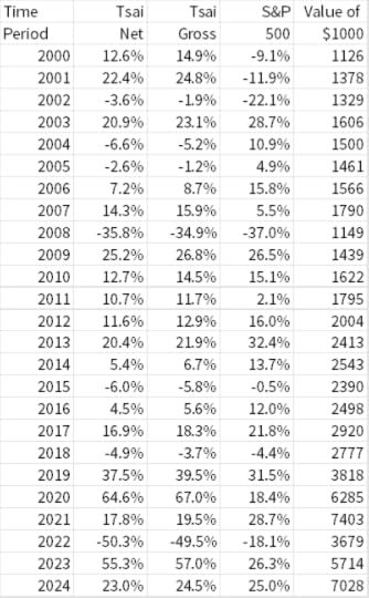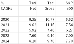 Tsai Capital just celebrated its 25th anniversary and now invests on behalf of 60 clients, mainly wealthy families. Christopher emphasises the importance of capital preservation, although his fund had a rocky ride in the 2022 downturn. He held 21 positions at last year-end, many of which he has held for years. He reluctantly trimmed Tesla which had reached a 33% weighting because he had an opportunity to invest in QXO.