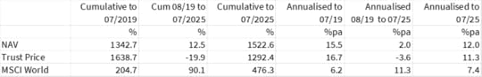 There has been a sharp reversal, partly a reflection of the quoted trust moving from a premium to a discount and partly a fade in relative performance. The move to annualised data is a little confusing so here is the like for like, as provided by the company, as they disagreed with my calculations, although their data is slightly different: