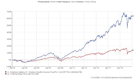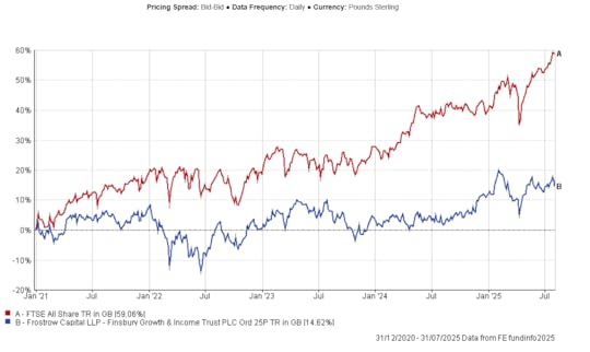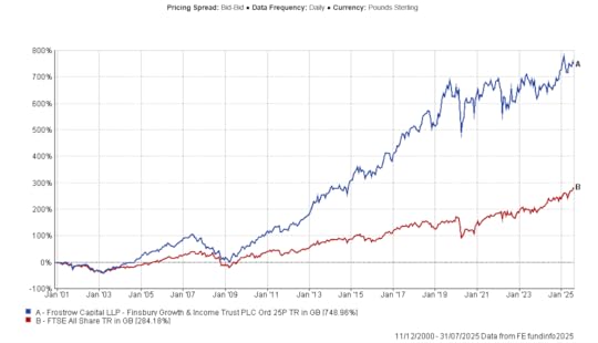This is clearer and cleaner if one looks at the Finsbury Growth and Income Trust. Here is the chart from inception to 2025 and these charts use the UK benchmark: