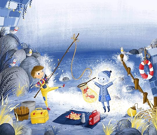 I moved back to the Isle of Wight the end of last year and ive been desperate to take a little bit of time out and squeeze in going back to my favourite places growing up, i havent been able to take much time off but i managed a quick drive to my favourite beach the other evening, The Duver, if you ever come to the island it is definitely a hidden gem that you need to visit.Down some winding roads and nestled in a quiet bay is a beach that has grassy hills and a little lake and a beautiful view out to the sea. I loved escaping there when i was younger. i used to spend long summer evenings there having BBQs with my family and playing in the sea, and also running along the sandy grassy hills and playing games.When i saw the colour Serenity for this weeks Colour Collective i could only think if these peaceful summer memories. I decided to use my favourite place as inspitarion as it perfectly described how i used to feel. A little boy fishing i thought would sum up this peaceful feeling and so he is not lonely his imaginary friends has come along so he can catch his fish. Of course when you go fishing you have to take a picnic...