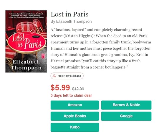 If you haven’t picked up a copy of Lost in Paris yet, now is the time to do it! You can grab the e-book for $5.99. However, that price won’t last long… It will go back to its regular $12.99 price on May 30.You can find buy links here:https://www.bookbub.com/.../lost-in-paris-by-elizabeth...