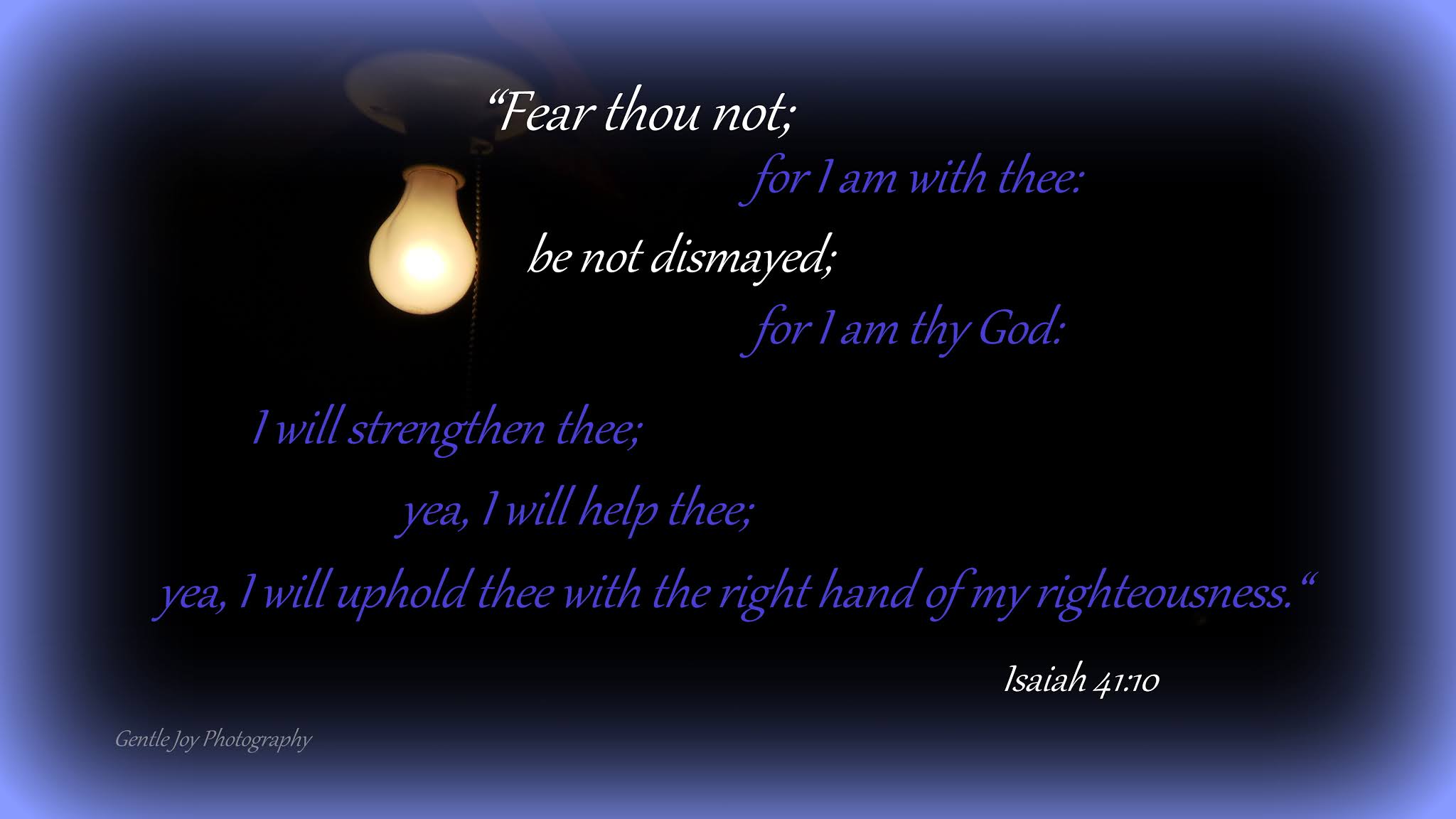 We will be faced with fear. This verse tells us that God is bigger than our fear and that He will be with us and strengthen us. It says to "fear thou not", BUT it also tells us some of the ways He will help us. We turn to God and He is our help. God doesn't just tell us not to be afraid without telling us how we can do that and we shouldn't do that to others, either. We need to direct people, especially our children, to the One who knows our fears and can do something about them. Words of "Fear Not" or "Don't be afraid" are empty without something behind them. What a blessing that God tells us not to fear AND tells us He is fully able to take care of us.