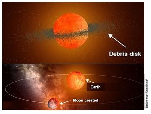 The scientific view is that the moon originated from the impact of a smaller Mars-sized planet with the earth. This is called the Giant Impact hypothesis. The cataclysmic collision resulted in a large cloud of debris that orbited the earth. Over time, the dust in this cloud clumped together to form the moon. The adjacent illustrations (source: OpenLearn) are a simulation of the last two stages of this event. This is a field of study that is not considered settled, and this hypothesis has a few variants.