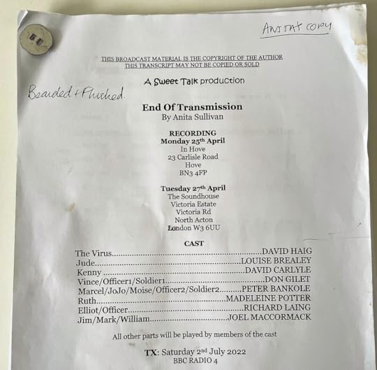 ‘End of Transmission’ was broadcast on BBC Radio 4 July 2nd 2022 (also on BBC Sounds and iPlayer). It was a Sweet Talk production directed by Karen Rose, with sound design by David Thomas.