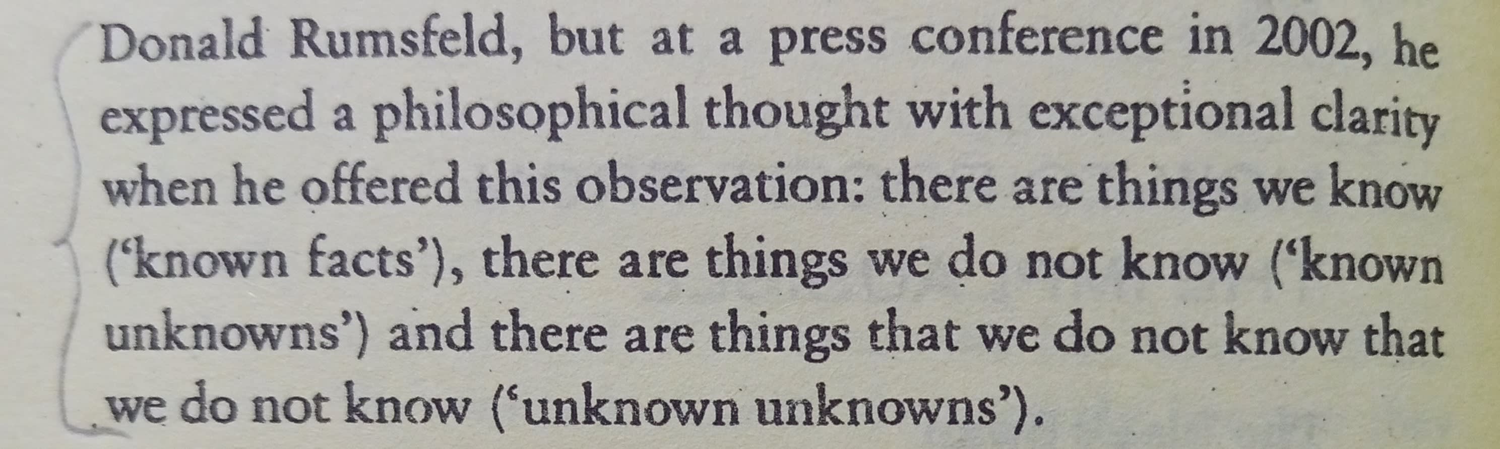 কথাটা ইউএস এর প্রাক্তন ডিফেন্স সেক্রেটারি ডোনাল্ড রামসফিল্ড এর। ২০০২ সালের প্রেস কনফারেন্স এ তিনি বলেন— ❝There are known knowns, things we know that we know; and there are known unknowns, things that we know we don't know. But there are also unknown unknowns, things we do not know we don't know.❞