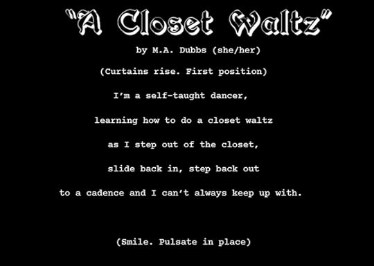 Next, I had a poem published with Opal Age Tribune: Performance. I really liked the theme of “performance” and the various ways it could be interpreted. The poem that got accepted was “A Closet Waltz” which explores my LGBT identity and ways I perform (and don’t) this identity. I used stage cues throughout the piece to show times when I feel comfortable being “out” and times when I feel uncomfortable. Living in Indiana, I don’t always know who I can trust with my identity and if I will be accepted or accosted. After my local library had book bans on mostly LGBT+ books, I felt even less sure in my community. You can read the digital issue on their site: https://www.opalagetribune.com/performance/#melinda-waltz