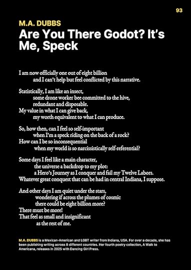 Anyway, my poem explores the human polarity of self-importance versus straight up nihilism. Nihilism is a world where you are most valued by what you can produce (a.k.a how much money can be squeezed from and out of you) but also nihilism in the realization in how completely unimportant we are in an ever-expanding, timeless universe. Sometimes I find relief that no matter what mistakes I make, I know that literally nothing matters on an universal scale. Although, a single human making ANY mistake that would impact something on a galactic level would be one hell of a fuck up! You can read the entire digital issue here: https://heyzine.com/flip-book/c6ed482270.html#page/1