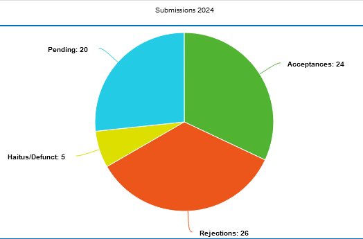 As for submissions this year, my list was a bit smaller this year. Last year I submitted to 101 publications and this year I submitted to 75. Out of 75, 24 were acceptances, with 26 rejections and the rest are still pending or are probably defunct/in hiatus hell. (I also still have a pending submission from the New Yorker from last year. No surprises here!) I’ve tried to be more mindful of where I’m sending my pieces because time is precious and I want the limited time I have to submit to be fruitful for both myself and the editor/publisher. My acceptance to rejection ratio has improved from last year, so I think this is showing some good progress.