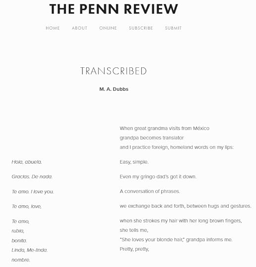 Issue 74: Winter is now live from The Penn Review! My poem “Transcribed” was published in this issue and explores my struggle with my Mexican-American identity and learning Spanish. I really enjoyed this poem and it came so quick and naturally, hardly any edits. I also enjoyed playing with form, with Spanish in the left margin and English in the right. I really wanted to show the disconnect I have felt at times from family and language. You can read my piece here: https://www.pennreview.org/transcribe