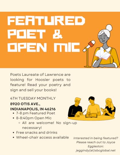 Saturday April 5th 2025 at the Fort Ben Branch Public Library (9330 E 56th St, Indianapolis, IN 46216) from 10:30 am to 1:30 pm we will be reading from our various collections and even have our books for sale. This is a great chance to hear from, meet, and support local Hoosier writers, most based off out Indianapolis. We will also have an open mic so you can share your own writing, too!
