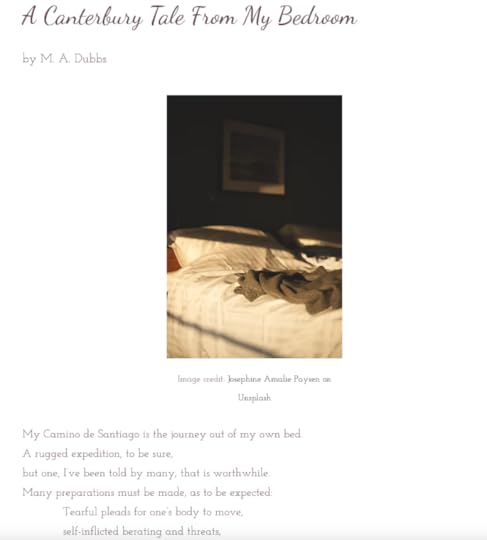 I really resonated with this mission and love the intersection of gender, education, and mental health combining in a unique way I don’t see often in other journals. My pieces explore my journey with mental health. “A Canterbury Tale from My Bedroom” explores how anxiety and depression create isolation within the home. I was inspired to write this poem after attending a poetry open mic (ironic!). An individual there was discussing their hike through the Camino de Santiago and encouraging others to fly out and embark on this great journey to help find creative sparks!