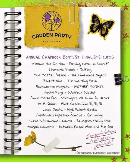 My chapbook “Ain’t No Lie, I’m Bi, Bi, Bi” was selected as a finalist through Garden Party Collective’s annual chapbook contest. I’m thrilled to be selected as a finalist and that my manuscript was enjoyed by the judges.