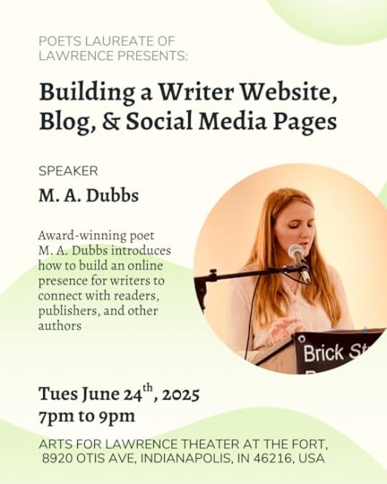 I’m thrilled to promote a workshop I will be running with host Poets Laureate of Lawrence. This workshop “Building a Writer Website, Blog, & Social Media Pages” will introduce writers and building their online presence to help attract attention from readers and publishers along with connecting with fellow authors.