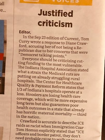 I also had my first op-ed published in my local newspaper. I’m happy to have the freedom and platform to share evidence-based and researched facts into the negative political fallout occurring in Indiana at present. I actually didn’t know this was being published into I sat down to read the paper (yes, I’m an old curmudgeon) and recognized my writing. The news world publication is different than the literary world because usually there’s a back and forth of edits and notice of publication. The world of journalism moves much faster than literature…and the sky is blue and water is wet!