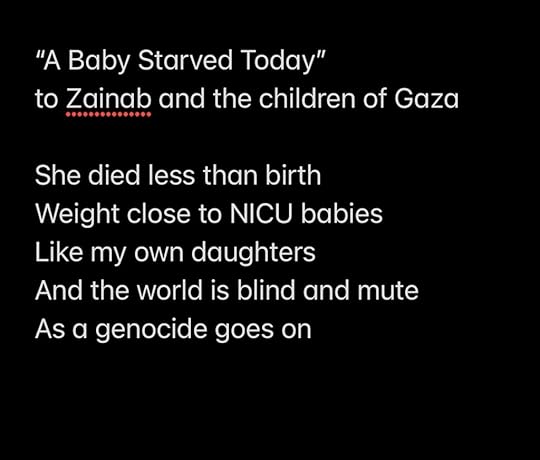 I have continued to expand my advocacy with attending peaceful protests and boycotts. I wrote a tanka titled “A Baby Starved Today” after reading an Associated Press article about the death of a child in Gaza named Zainab. She died of starvation, weighing less at death than when she was born. I was so distraught by the article, especially as a mother myself, that I felt writing was the only outlet. Here is hoping the ceasefire continues to hold and relief can go in to help these children.