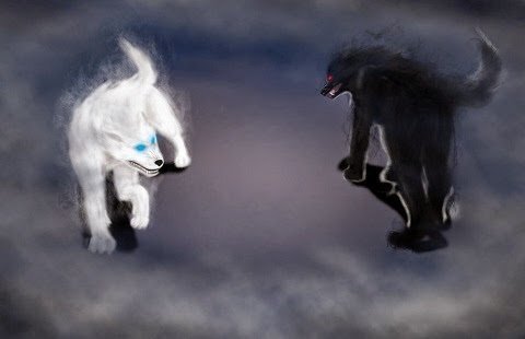 Once in a blue moon, the white Cadejo has defended some drunkards from the black’s lick. On those nights, when both are face-to-face (figure 1), they enter into fierce and bloody combat. The white spirit tries to protect the man while the black one attacks him until they can reach an agreement of whom is right.