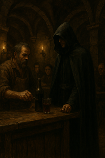 As the night deepened, the tavern's heavy wooden door creaked open, admitting a stranger cloaked in black. His presence was commanding—tall, with piercing eyes that seemed to glow with an inner fire. He spoke little, ordering only a glass of the tavern's strongest brew (figure 1), which he sipped slowly, observing the room with a knowing smile.