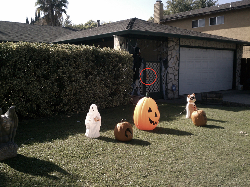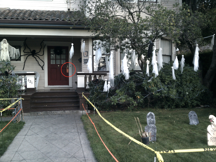 Circled in red: Door note placement in Petaluma, California (the first year of placing notes)Fast forward to today: I could use your help partners! Starting this year, YOU could help spread encouragement by posting your own "HALLOWEEN KID APPROVED" door signs. All you need to do is print this image below on orange colored card stock paper, cut it in half, and then cut the circle where the knob or handle will fit.