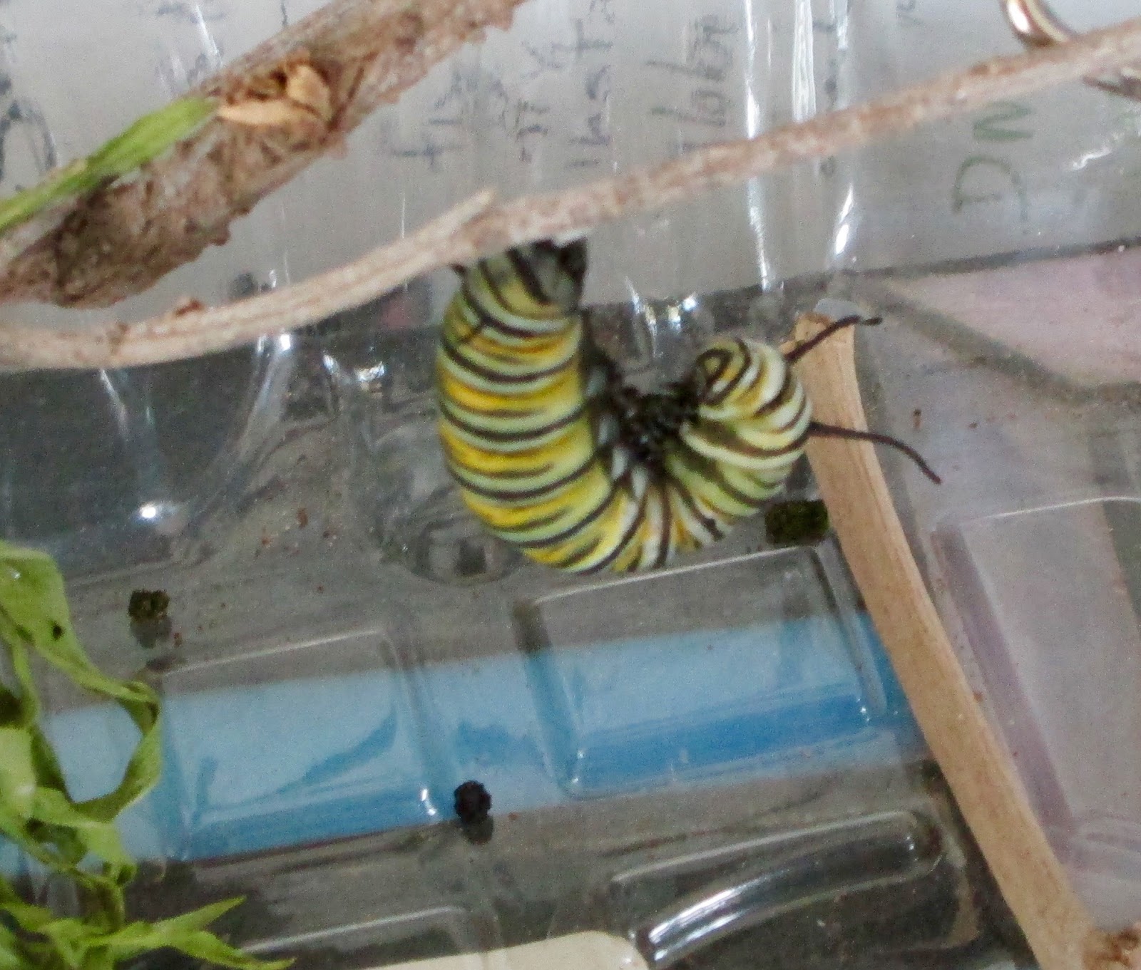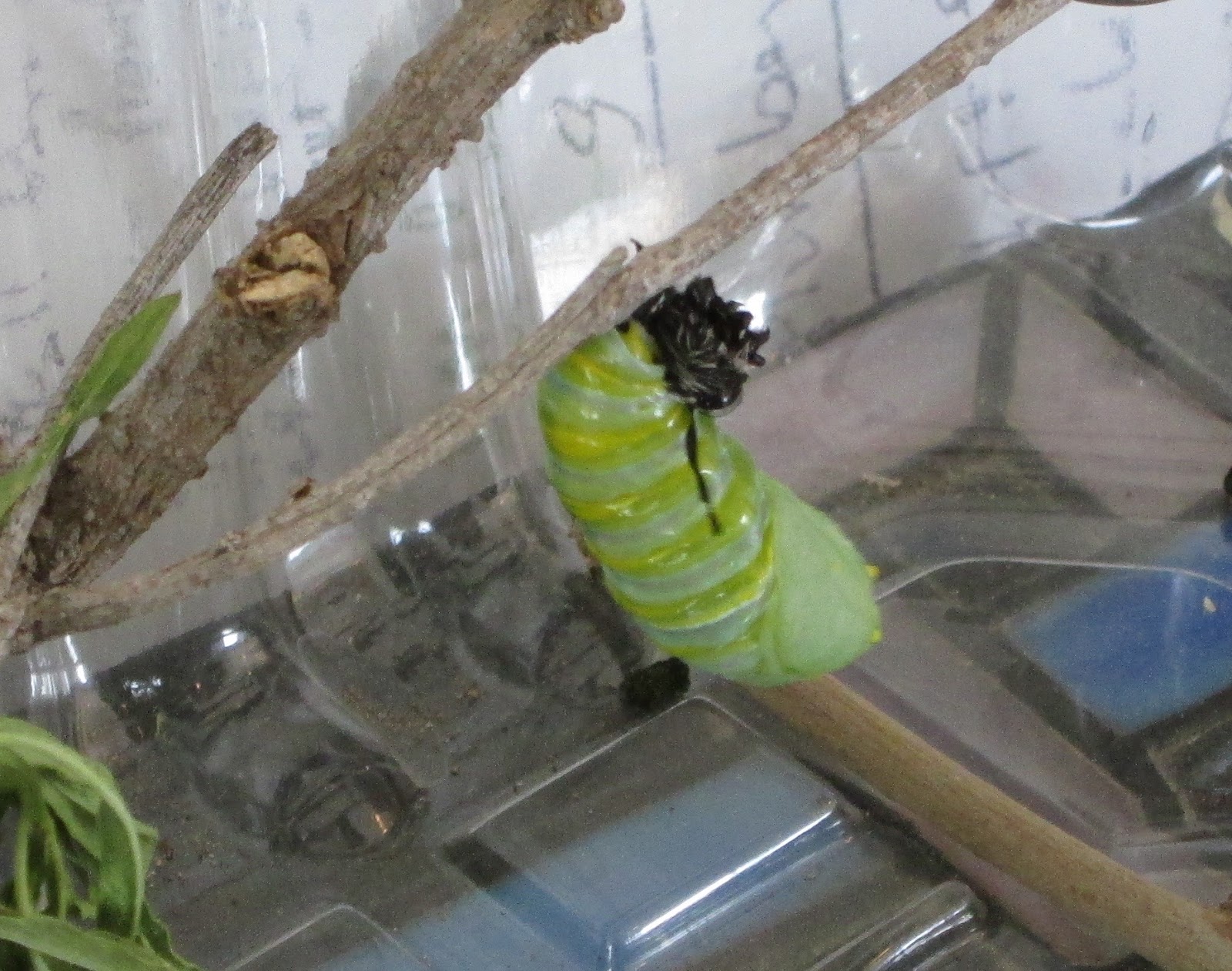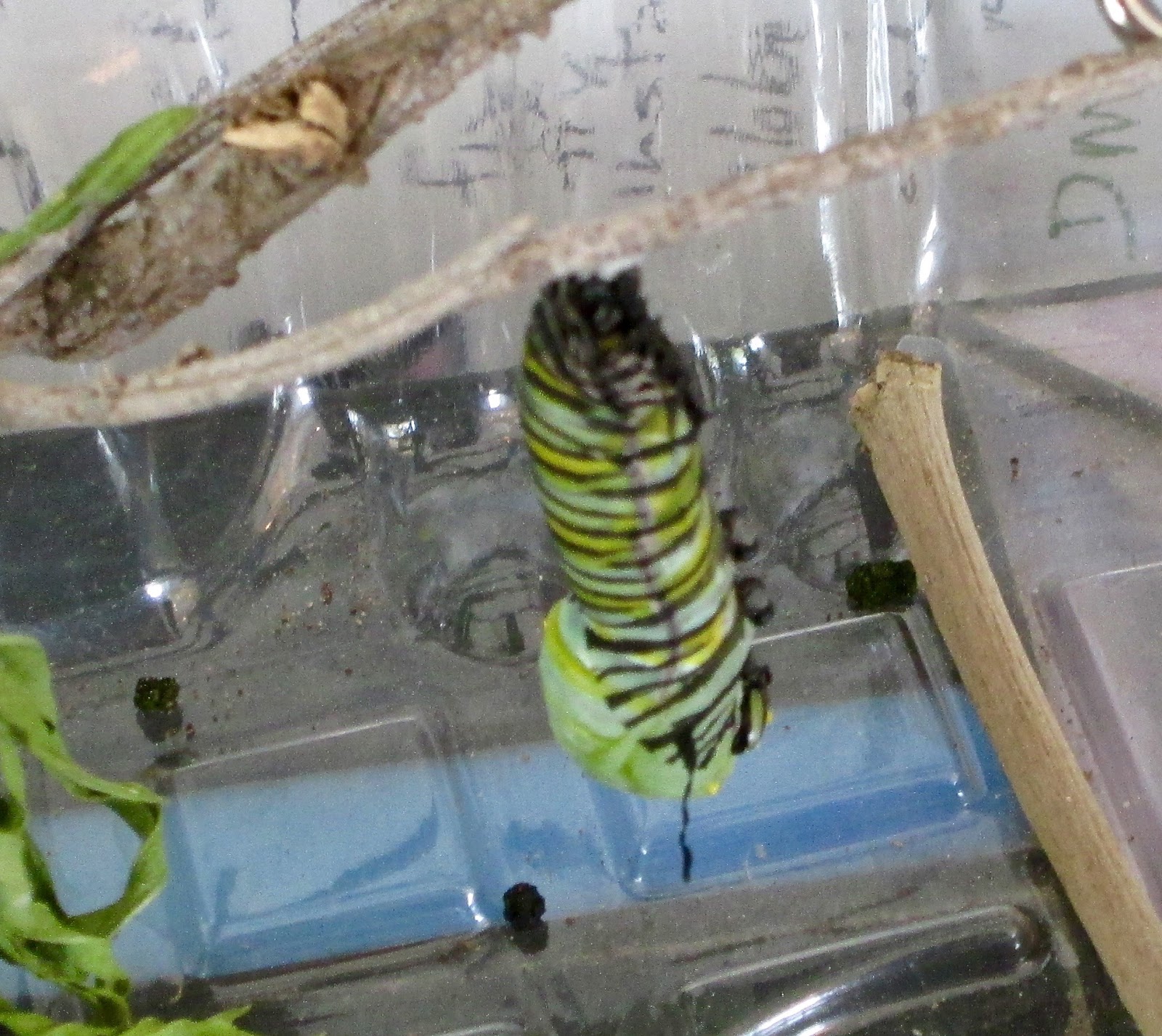 Yesterday, it stopped eating and roamed its enclosure in apparent distress. About 8:30 pm when we checked it, it was hanging in a J shape, the sign that it is preparing to shed its last skin and reveal a chrysalis: