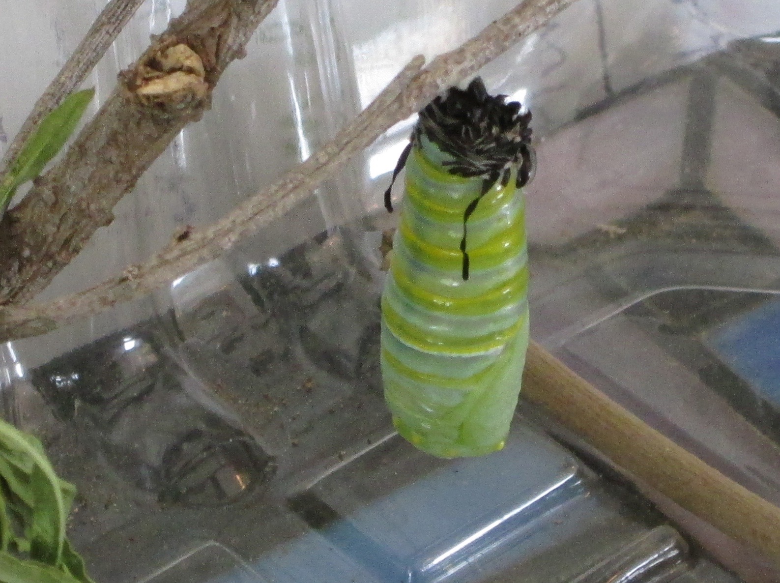 Now to wait. According to my caterpillar book, it will turn into goo inside and slowly reconstitute itself as a butterfly. It should emerge from the chrysalis in one to two weeks. I'll photograph its emergence for you if I'm lucky enough to see it.