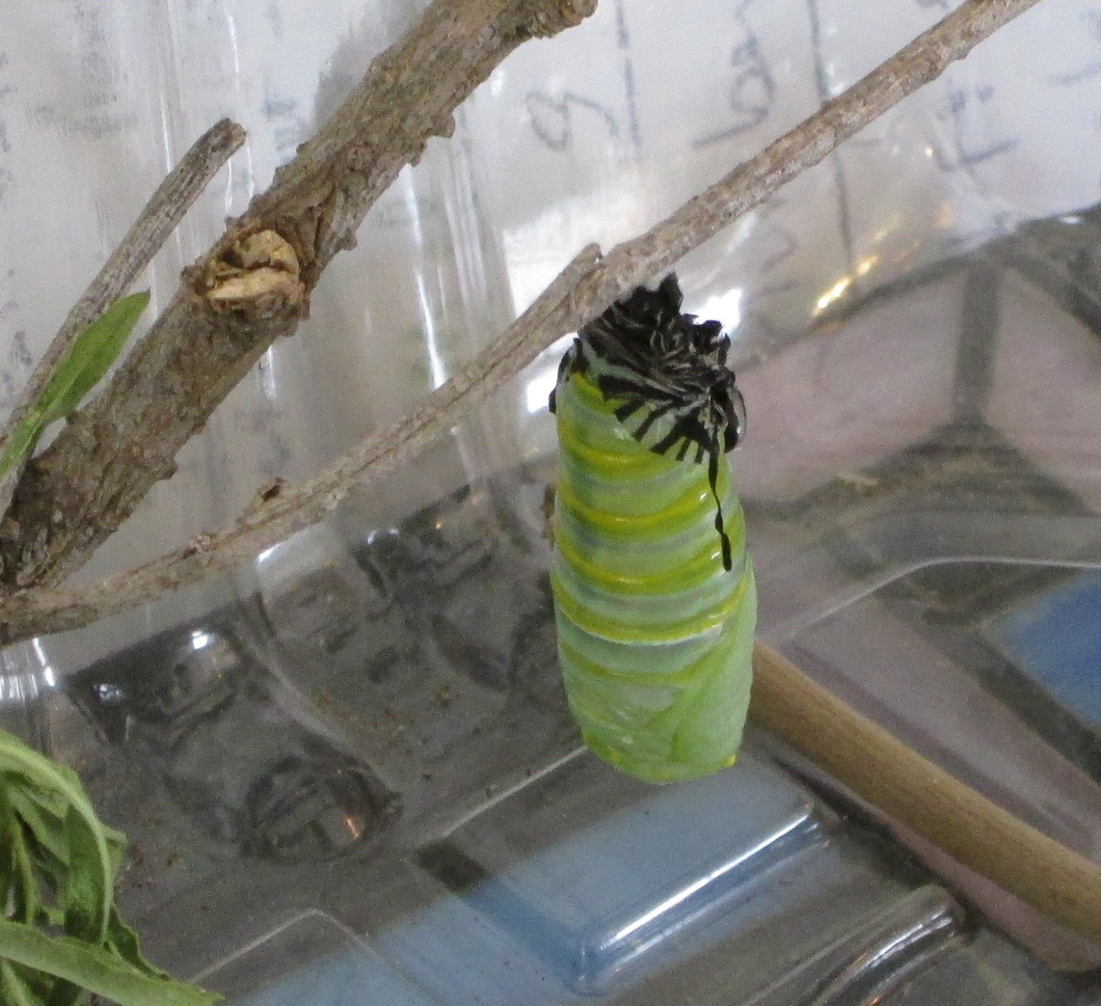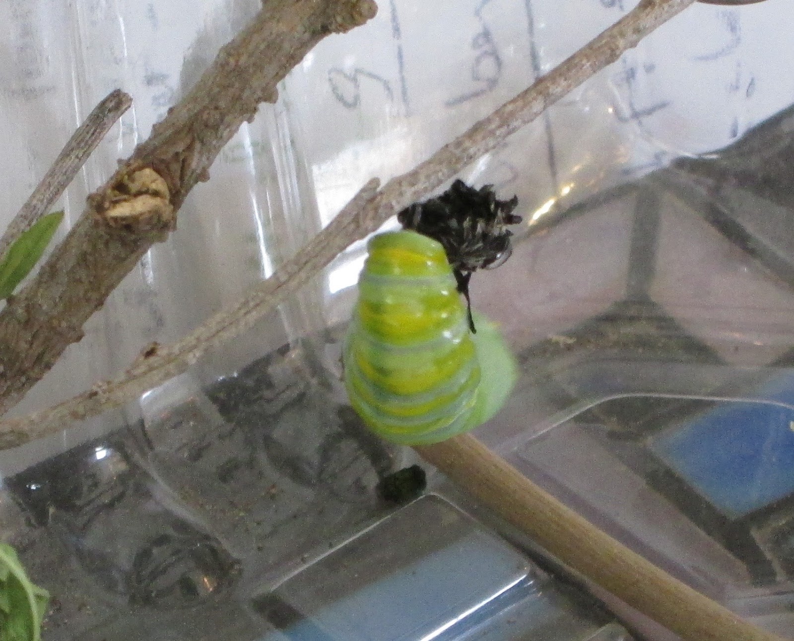 Yesterday, it stopped eating and roamed its enclosure in apparent distress. About 8:30 pm when we checked it, it was hanging in a J shape, the sign that it is preparing to shed its last skin and reveal a chrysalis: