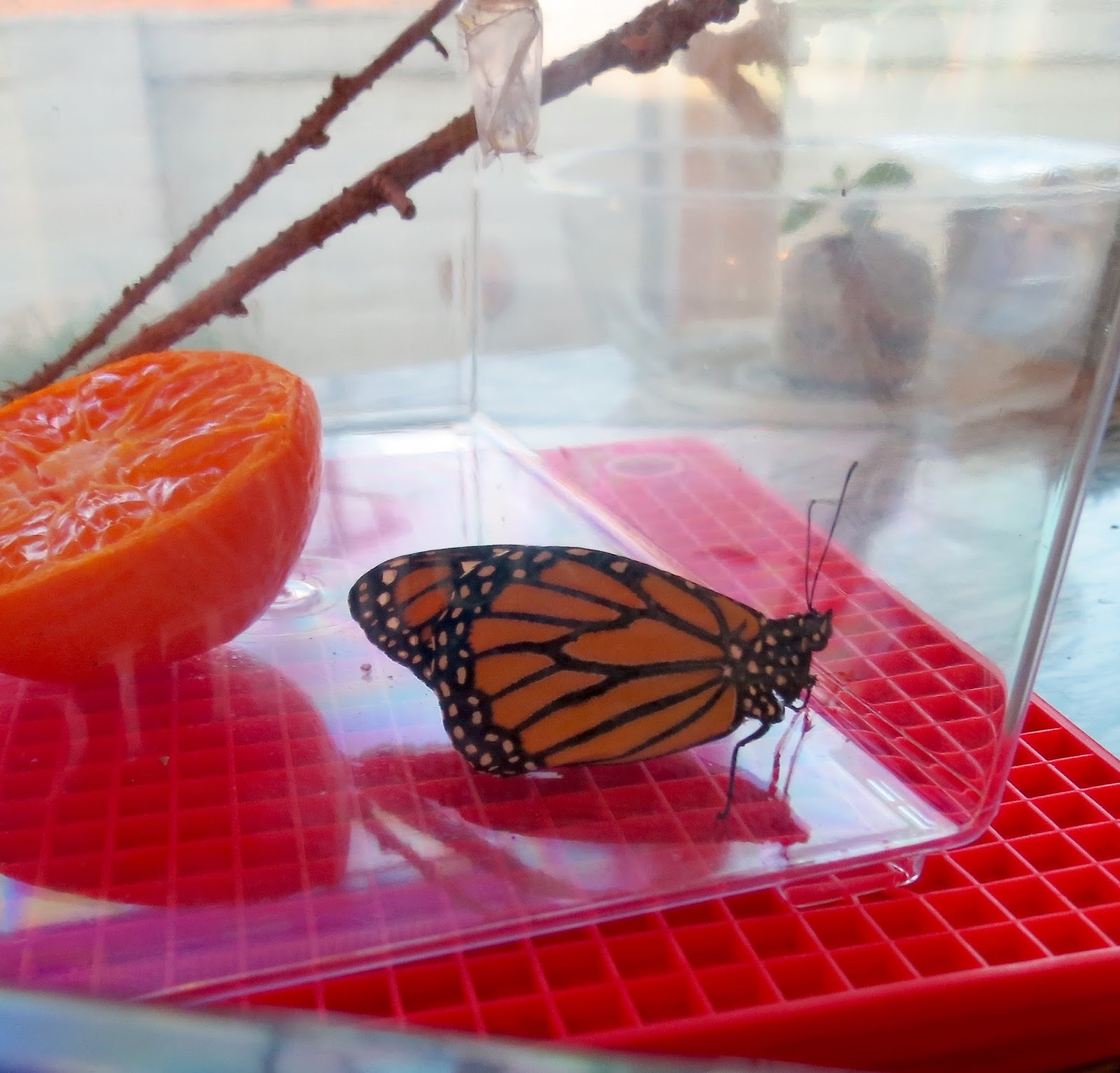 First shot of butterfly. Note the empty chrysalis hanging from a stick at upper left.