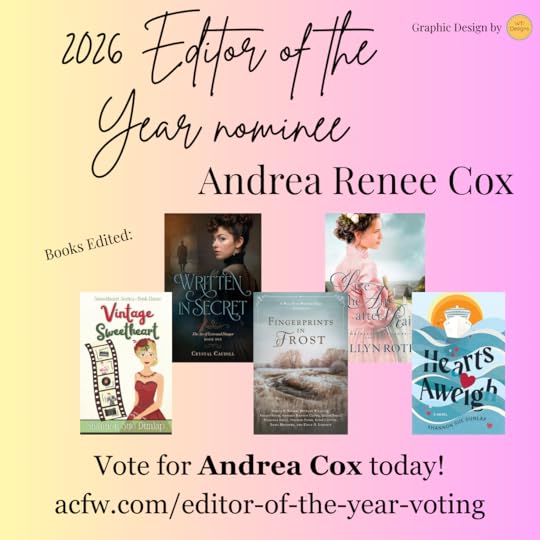 added a status update: Friends, I've been nominated for Editor of the Year. Woot woot! The finalists are revealed near June 1. Will you vote for me please? I'm listed as Andrea Cox. acfw.com/editor-of-the-year-voting