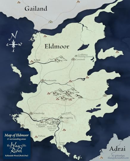 As a newsletter subscriber, I wanted to go further and give you a special peek into some of the things to come in Book Two by way of the new map. If you saw the last version of the map, you may notice that there are (at this writing) three new locations added to this edition of the map. Prior prime locations that appeared on the map that are in Book One include Kellandale Manor and Kellandale Wood, as well as towns and villages of Waterbridge, Craggybog, and Cavenwell, the nearest town to Coddlefin’s Training Grounds.