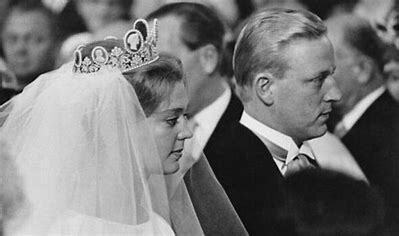 In the autumn of 1959, Birgitta travelled to Munich in Germany in order to study German. . There she met the German prince and art historian Johann Georg von Hohenzollern-Sigmaringen, known to his friends as “Hansi” at a cocktail party. Following a short courtship, the couple became engaged in December 1960. They subsequently underwent a civil marriage ceremony on 25 May 1961 in the Hall of State at the Royal Palace of Stockholm, the Mayor of Stockholm officiating. This was followed, a few days later, by a Roman Catholic wedding service at Sigmaringen Castle in Germany. Interestingly, the Princess did not become a Roman Catholic convert, retaining her Lutheran faith. A biographer of Princess Sybilla, Roger Lundgren, has stated that she had, in fact, made an application to join the Roman Catholic Church but this was rejected by the Church with words questioning her spirituality in the matter.