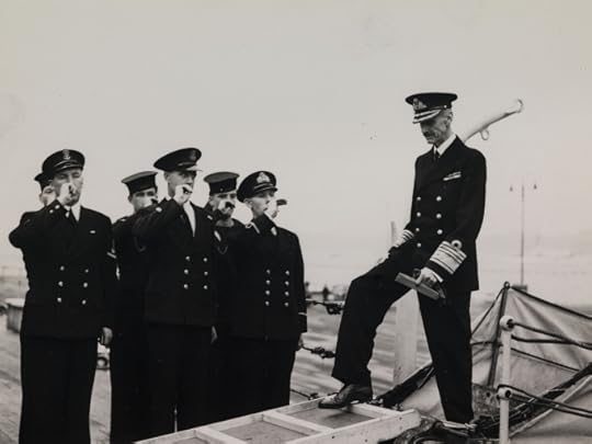 King Haakon emaks HMS Norfolk near Edinburgh 5 June 1945In the early afternoon of 5 June, amid considerable ceremony, the royal party boarded the British cruiser and flagship of the 1st Cruiser Squadron, HMS Norfolk, at Rosyth Dockyard. The Norwegian Royal Standard-a rampant gold lion on a red background-was hoisted from the mainmast as soon as the King set foot on the gangplank; while the Royal Marine band played the Norwegian National Anthem. Vice-Admiral Rhoderick McGrigor was waiting to greet the King and the other members of the Royal Party. HMS Norfolk was escorted throughout the crossing by HMS Devonshire, the vessel which had transported King Haakon, Crown Prince Olav and the Norwegian government over to exile in Britain almost five years earlier. Other ships in the convoy included the Royal Navy O-class destroyers HMS Offa, HMS Onslow and HMS Orwell, as well as the Royal Norwegian Navy S-Class destroyer, HNoMS Stord.