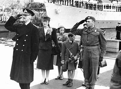King Haakon takes the salute with his son Crown Prince Olav. Behind are Crown Princess Märtha, Princess Ragnhild and Prince Harald. Princess Astrid is obscured behind her father. King Haakon landed in Oslo, at 12 midday on 7 June, exactly five years to the day since he departed Tromsø for exile in Britain to carry on the fight against Germany. This was also the 40th anniversary of the famous vote in the Storting [Parliament] which dissolved the union between Norway and Sweden. Crown Prince Olav came aboard HMS Norfolk at Spro and must have been somewhat startled at the sight of his three children dressed in oversize duffle coats (borrowed from the crew) against the biting winds. Indeed, Princess Astrid remembered that the weather was so bad at times that those on board could not see the land. However, soon small craft were spotted, decorated with foliage and flags, coming almost alongside in greeting as the vessel progressed up the Oslofjord. The duffle coats were soon swapped for “Sunday Best” clothing for the welcome home festivities in Oslo. Three hundred thousand people (other sources state 500,000) were said to have lined the Oslofjord. Ships in the harbour blew their whistles and let-off star shells.
