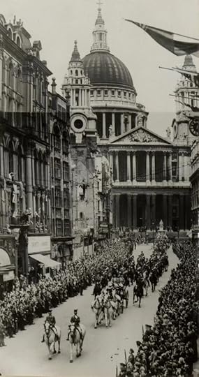 The King and the Queen continued to be called onto the balcony by the crowds outside the Palace and would later note that ‘we went out 8 times altogether during the afternoon and evening. We were given a great reception.’ In between the various balcony appearances, the King had held audiences with the War Cabinet and the Chiefs of Staff. His Majesty was at his most ebullient when he told them, ‘You have brought this country-I may say you have brought the whole world-out of deadly peril into complete victory.’ It was after midnight when the King and Queen made their final appearance together on the balcony, the princesses Elizabeth and Margaret having been permitted by the King to leave the Palace and enjoy the atmosphere on the surrounding area of St James Street and Piccadilly. They both cheered their parents on the balcony from outside the railings of the Palace, having previously sent in word, through an aide, that they were patiently waiting there.
