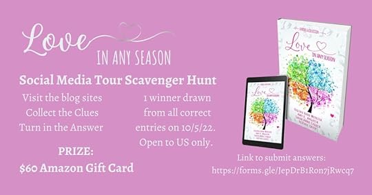 The Love in Any Season Social Media Scavenger Hunt is here! To celebrate the release of their new novella collection, Love in Any Season, the authors are hosting a fun social media scavenger hunt.