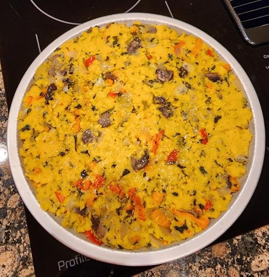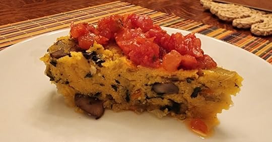 This recipe was inspired by one I saw on plantbasedonabudget.com (Easy Spinach Pie). I did a little substituting and greatly shortened the description (I believe it shouldn’t take longer to read a recipe than to prepare it), so you can get right to making this delicious pie. It would be the perfect savory vegan addition to any brunch or a covered-dish dinner. It’s so colorful, easy to prepare, requires only simple ingredients, and needs no baking! I topped each serving of my pie with deli-bought bruschetta which provided added color and flavor. Perfect!