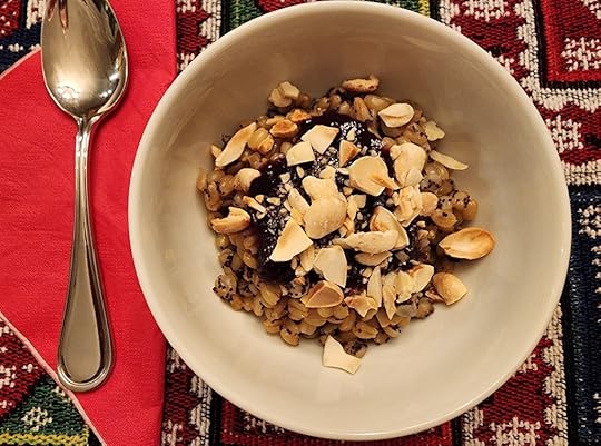 Use fresh poppy seeds. Stale seeds can taste bitter and slightly rancid after grinding.You can find the book “Beyond the North Wind” by Darra Goldstein on Amazon.For the sour cherry preserves you could substitute raisins, dried cranberries, or apricots.I’m sure that even picky-eater, Katie, didn’t complain about sweet nutty kutya on Christmas Eve. You can have it as part of the main meal, as a dessert, or for breakfast.
