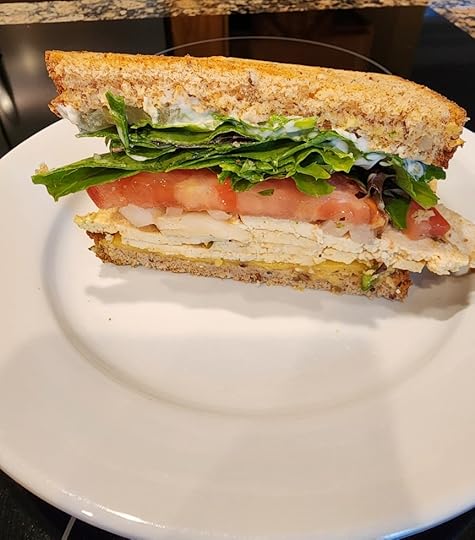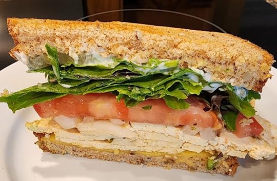 When done, remove from heat, but allow the tofu to cool in the pan to absorb as much flavor as possible. Tofu will suck up that marinade like a sponge. When ready, create your sandwich. Pile the deli “meat” on as thick as you desire. Makes a hearty, savory vegan sandwich, toasted with a slice of your favorite vegan cheese (we like smoked provolone). Add toppings: tomato, lettuce, onion, pickles, and your favorite condiments. Tofu deli meat will keep in the frig for several days. Enjoy!