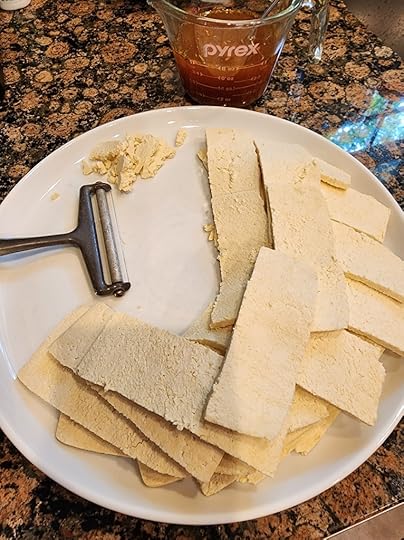 Set marinade aside and slice the drained tofu very thin. I used a cheese slicer to do this, but you could use a thin sharp knife instead.