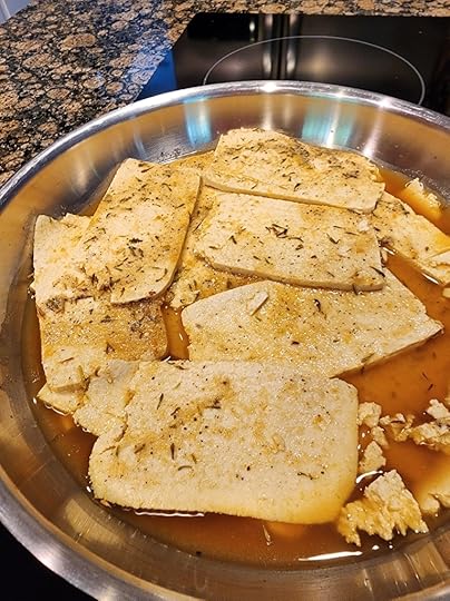 Turn heat on LOW and allow tofu to simmer gently for about 30 minutes. Do not let it boil, and do not stir. Tofu is very delicate and will easily break apart. I used a turkey baster to occasionally drip marinade over the top layer and a silicone spatula to lift slices to get some extra marinade between the layers of tofu as it cooked.