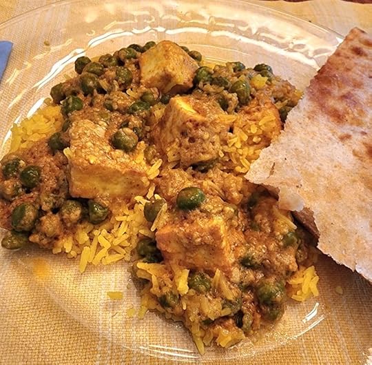 At The Clay Oven the food is always delicious, service is attentive, the simple diningroom is always clean, and prices are reasonable. Take out and catering are also available. We saw several orders being picked up while we were eating. I always leave with enough leftovers for another meal, and I must confess that because of my absentmindedness, this photo shows my full plate of leftovers the next day. This is Mattar Paneer with Kashmiri Naan (sweet Indian bread stuffed with raisins, nuts and coconut).